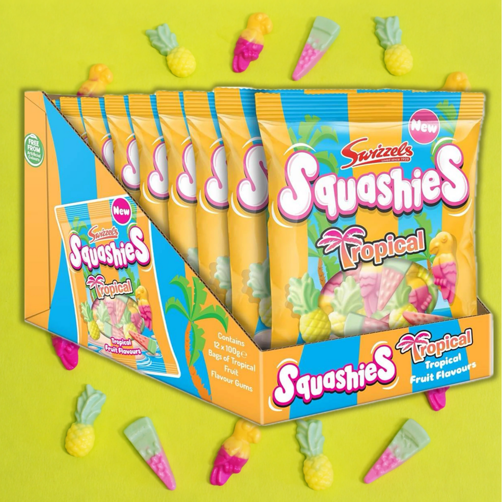 A big box of 12 x 100g bags of Squashies Tropical. These are fun and fruity parrot, pineapple and watermelon shapes in mouth-watering mango & passionfruit, pineapple and watermelon flavours, get Tropical!